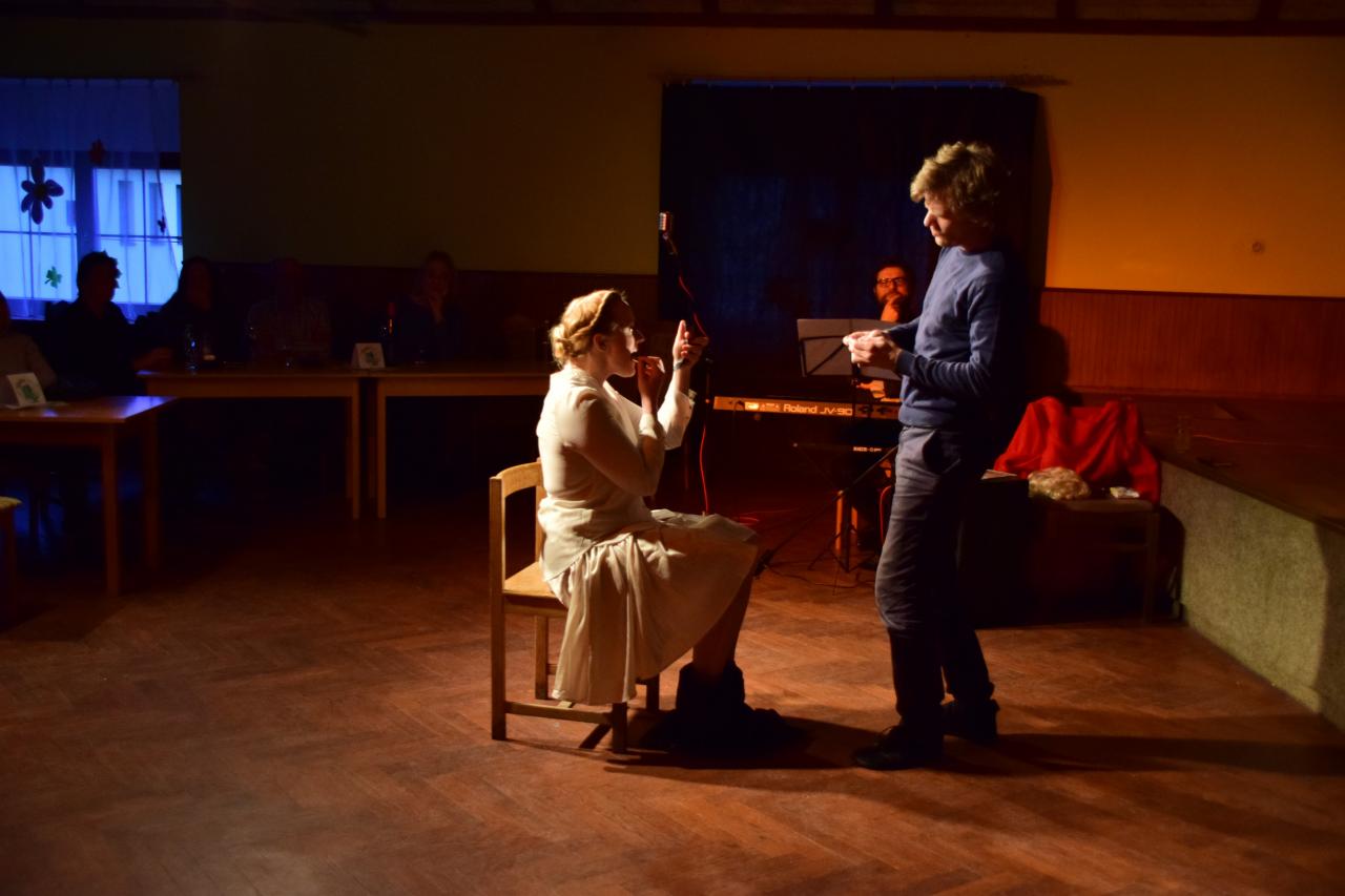 Divadelní představení s živou hudbou a zpěvem.