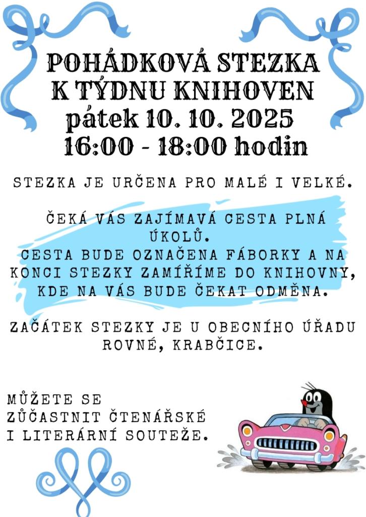 Pohádková stezka k týdnu knihoven na téma Krteček. V pátek 10.10.2025 od 16 do 18 hodin. Pro děti bude cesta označena fáborky. Cíl cesty je knihovna, kde si děti vyzvednou svou odměnu. A mohou se zapojit ještě do literární soutěže či jiných aktivit připravených v knihovně.
